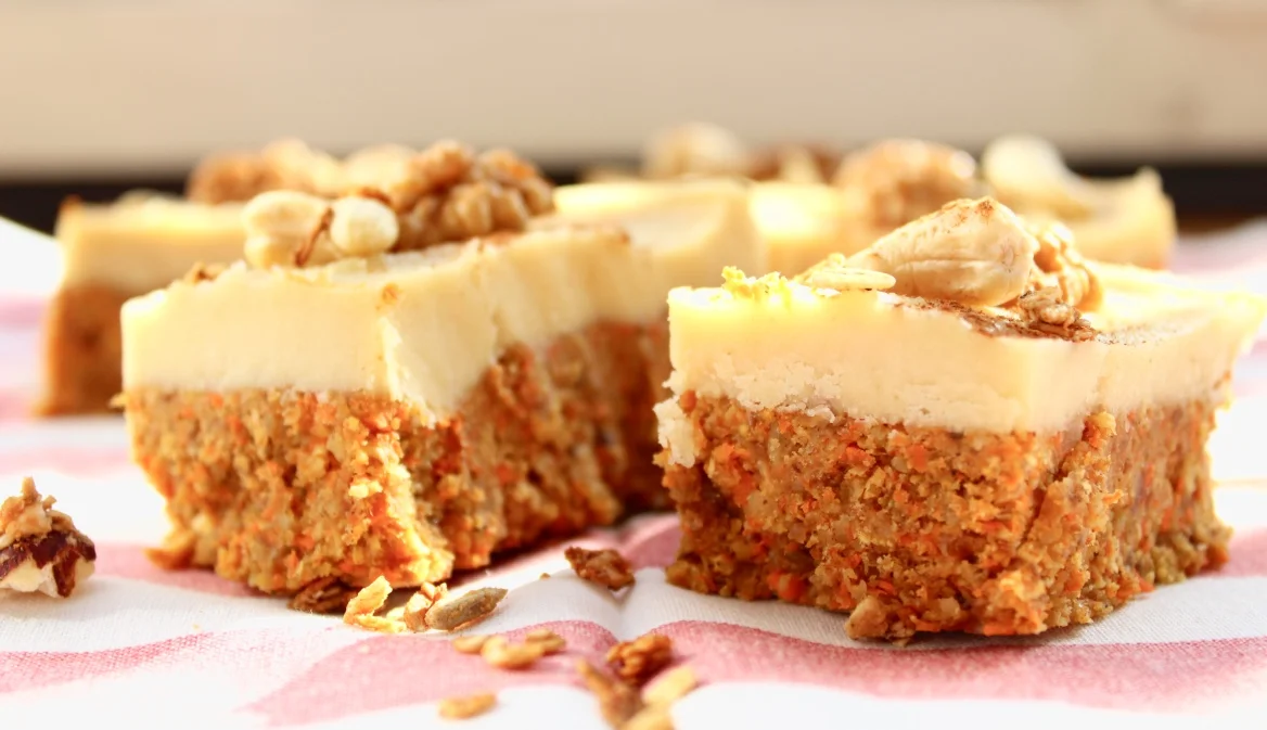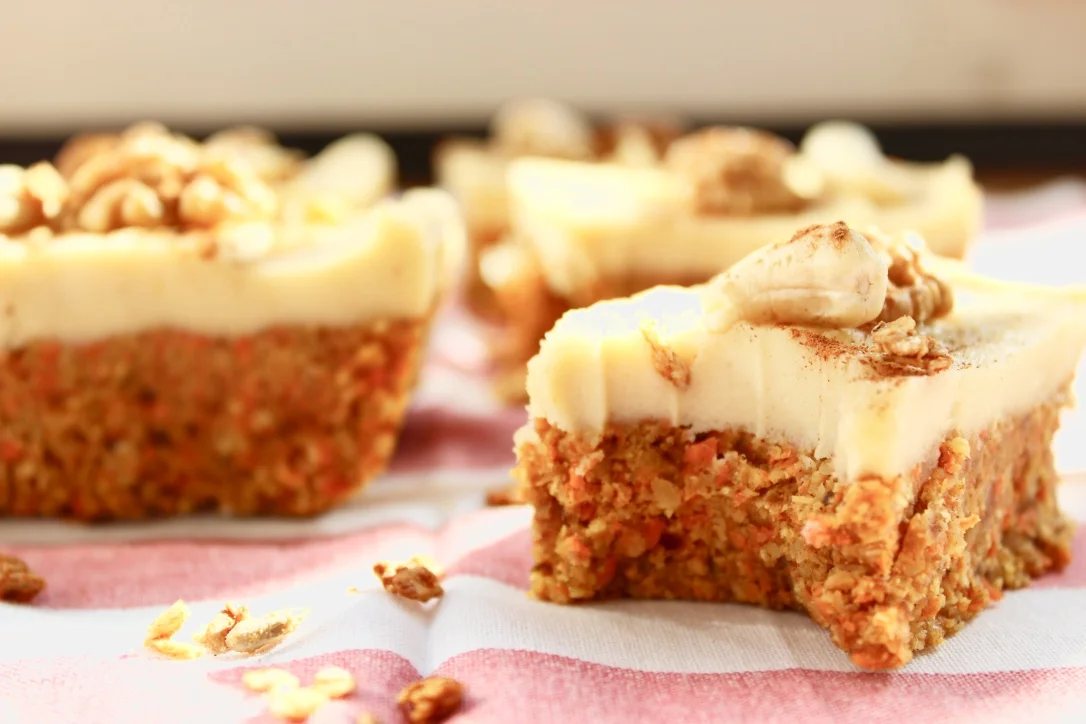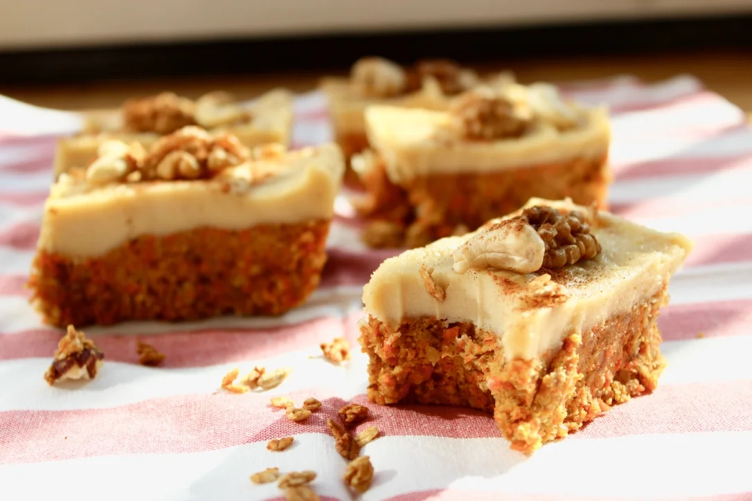 Placez les carrés de carrot cake au frigo et attendez minimum 1h30 avant dégustation afin qu'il obtienne une vraie consistance, texture et saveur de carrot cake.