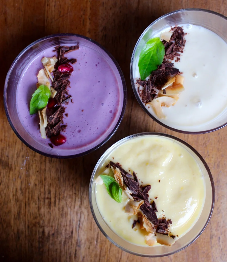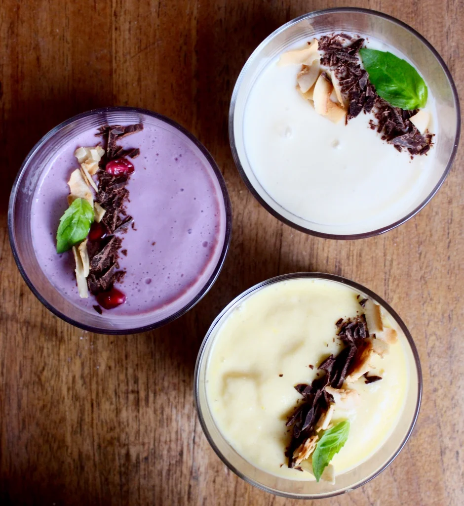 Ici je m'en sers pour en faire une crème la plus sexy qui soit avec des fruits, des copeaux de chocolat et de la coco grillée. Et honnêtement, quand le mariage des saveurs est bien fait, on obtient un dessert en moins de 5 minutes, vegan et surtout très bon. J'ai choisi d'en faire à plusieurs saveurs: à la grenade, à la mangue et au citron. Je vous indique donc les ingrédients de base pour former la crème pour ensuite la diviser en quatre et incorporer les saveurs de votre choix.