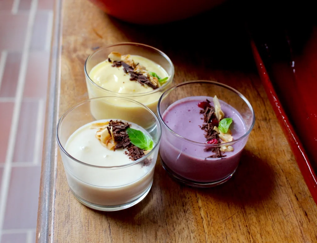 - Si vous souhaitez faire la crème qu'à une seule saveur: ajoutez le fruit de votre choix (les pépins de grenade, les morceaux de mangue ou le jus d'un citron) mixez de nouveau jusqu'à obtenir un mélange onctueux, versez dans des verrines et réservez au frais 2h.