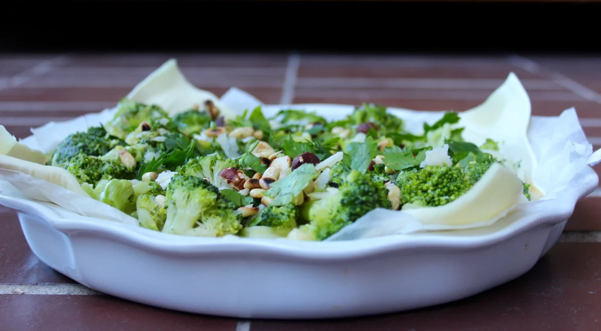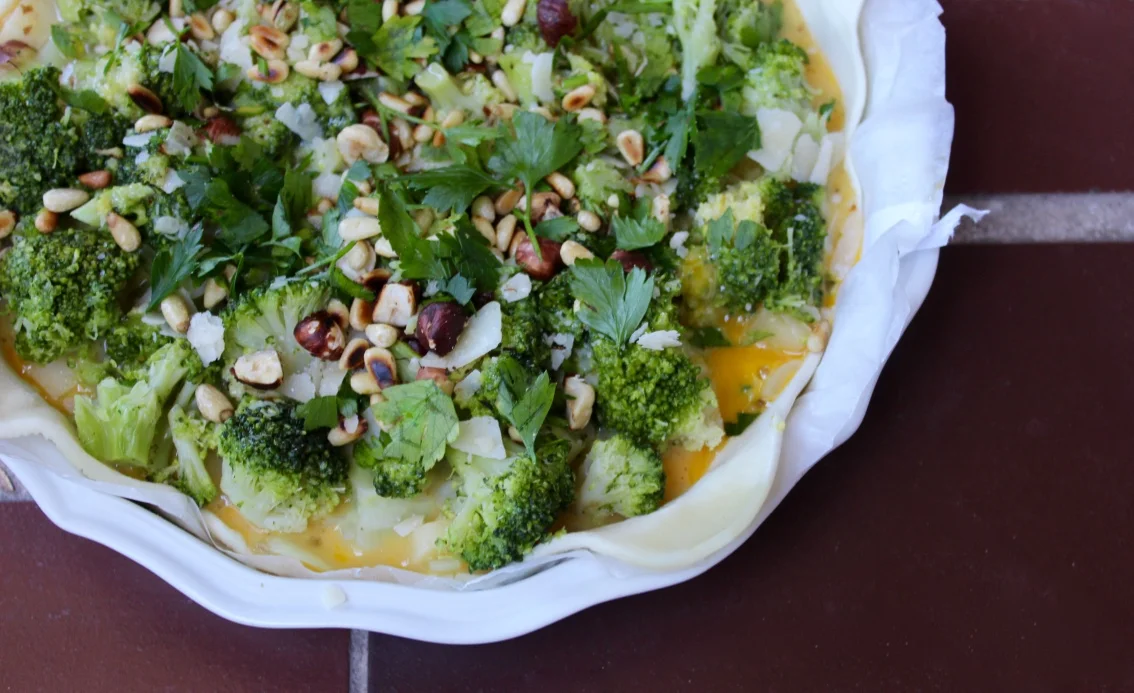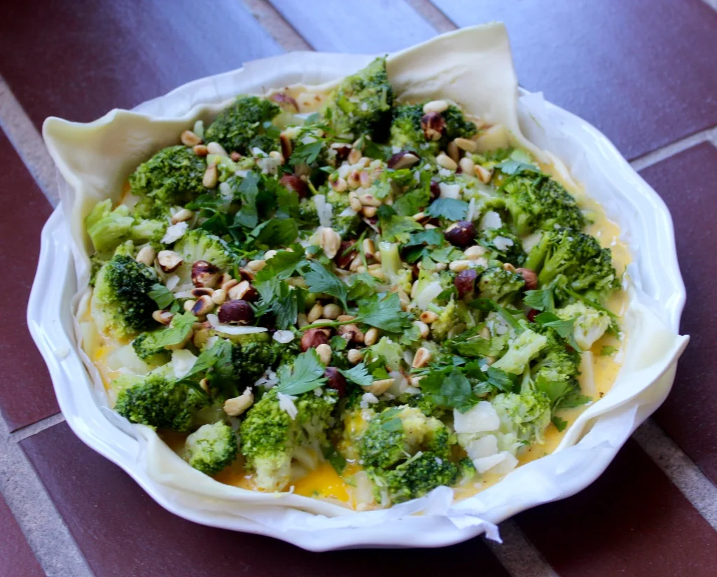 - Etalez la préparation oignon brocolis sur le dessus de la tarte, versez les oeufs battus, ajoutez les noisettes torréfiées, le persil ciselé, le zeste de citron, les copeaux de parmesan, salez, poivrez et enfournez pour 20 minutes.