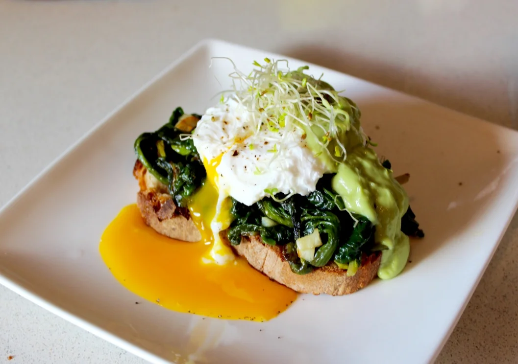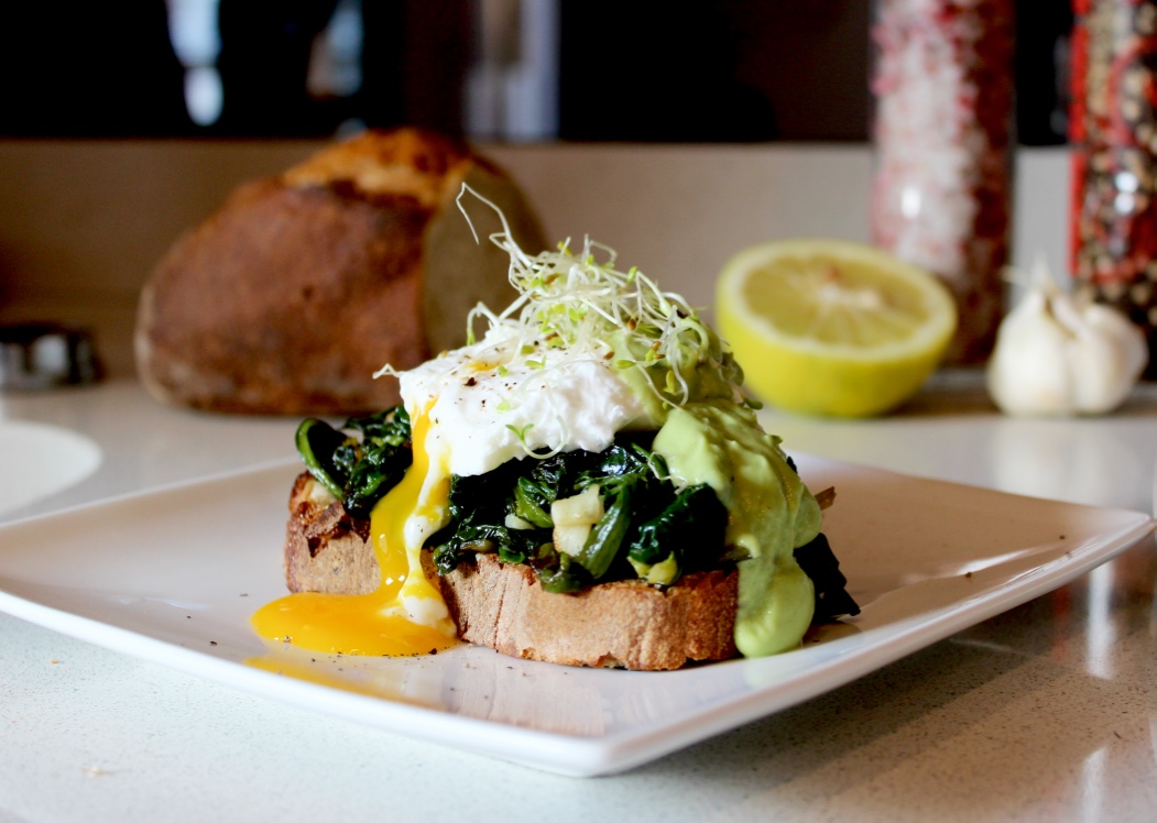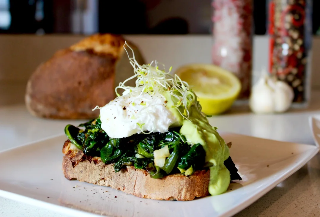 Une fois n’est pas coutume, mettons l'avocado toast de côté et attaquons nous au plat emblématique du dimanche, j'ai nommé l'oeuf Bénédicte. En 20 minutes chrono, on switch le muffin pour du pain complet, le bacon pour des épinards et la sauce hollandaise pour un coulis d'avocat au citron, le tout surplombé d'une délicate touche de graines germées.