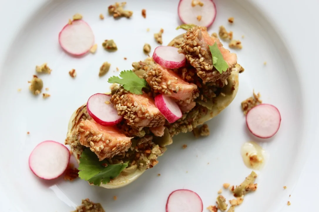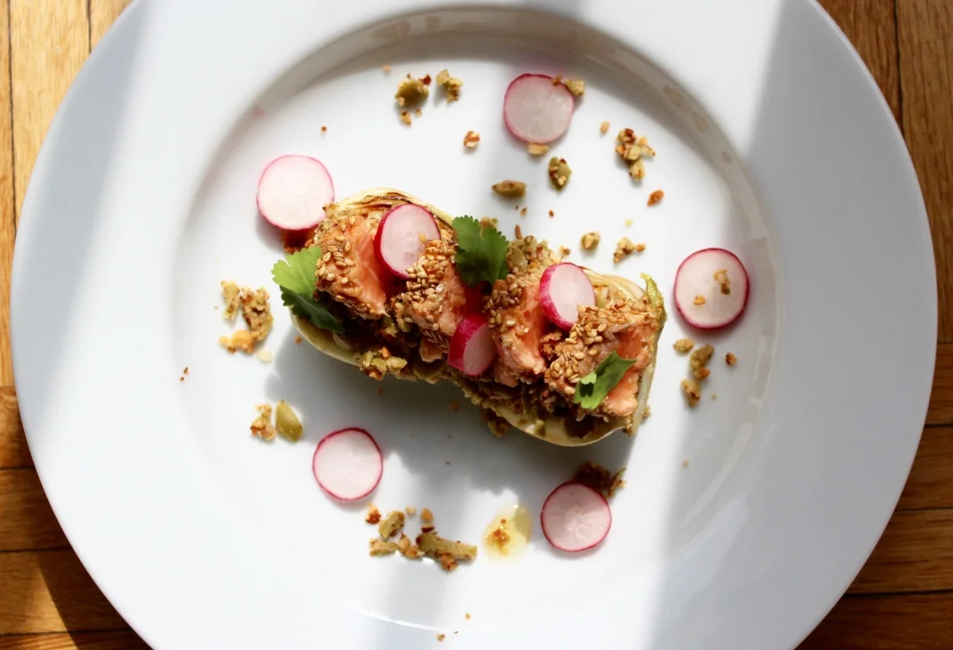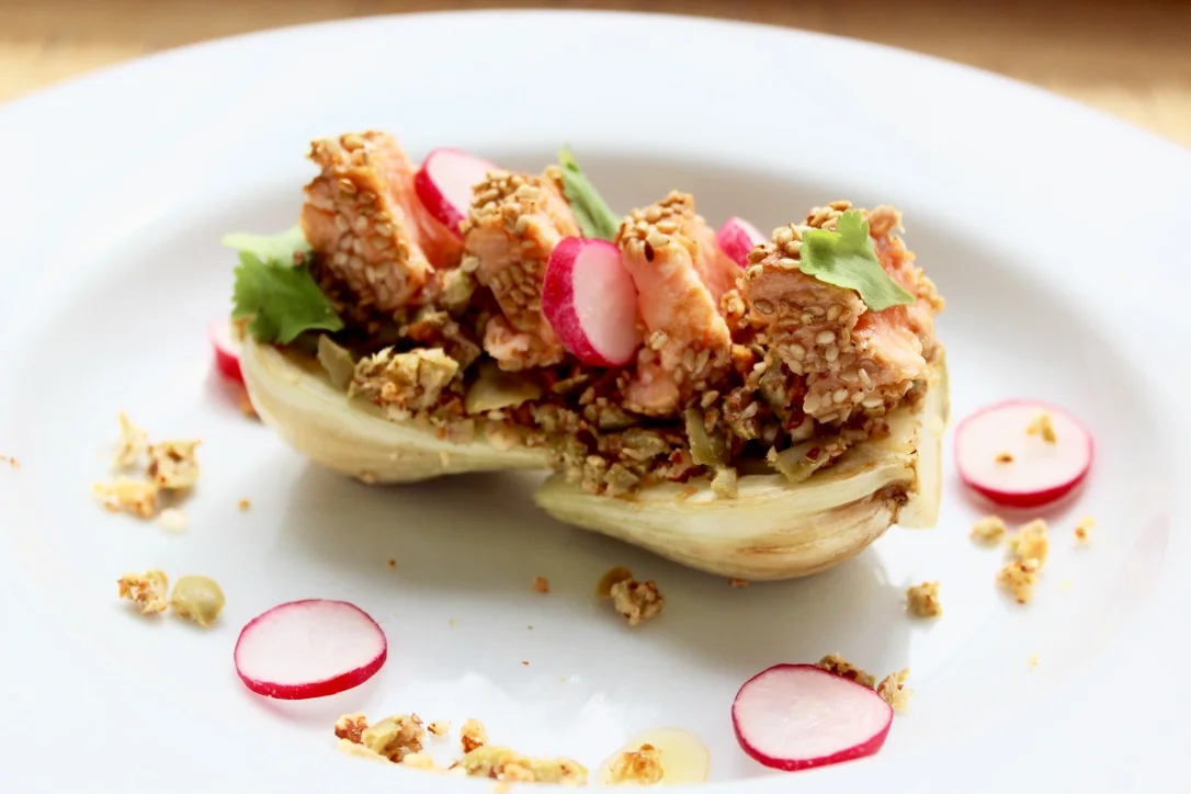 J'ai coupé un fenouil en deux que j'ai fait dorer de chaque côté, j'ai ensuite confectionné un petit crumble d'olives et amandes grillées pour rajouter sur le dessus les tranches de tataki de saumon. Le radis apporte un peu de croquant, la coriandre du gout et la sauce apporte saveurs et exotisme.