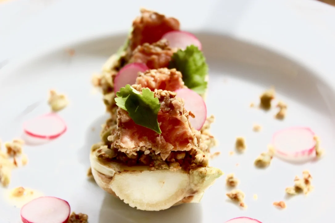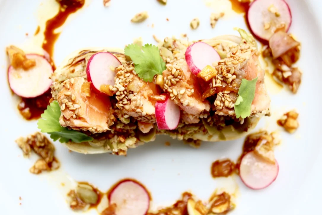 Le tataki, du cru à l’intérieur et tout juste saisi à l’extérieur, est une manière de cuisiner qui apporte au saumon mariné au sésame, gingembre et coriandre, deux saveurs intéressantes.
